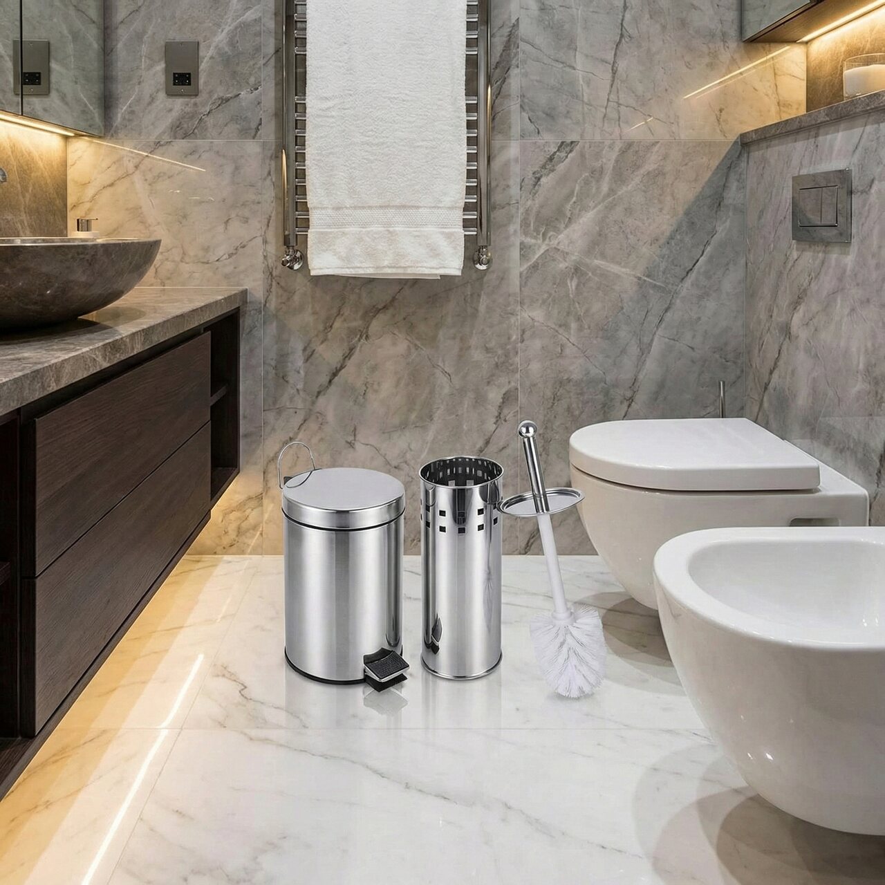 Projetado para unir praticidade, higiene e sofisticação, este conjunto é a escolha ideal para quem busca manter o banheiro organizado com muito estilo. Fabricado em aço inoxidável de alta qualidade, oferece excelente resistência à corrosão e ao desgaste, garantindo durabilidade e aparência impecável por muito mais tempo.