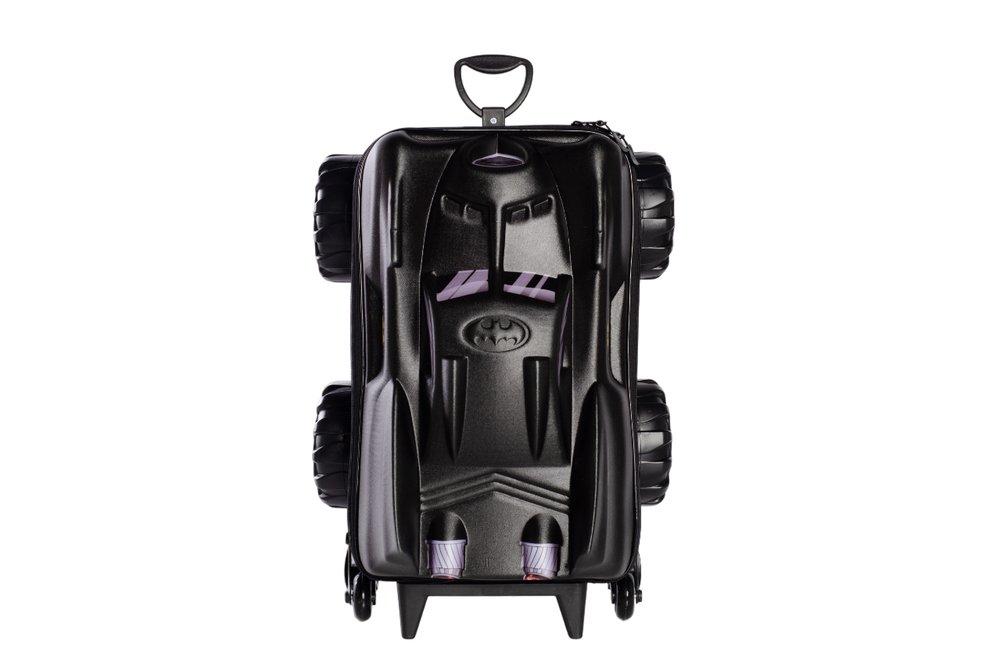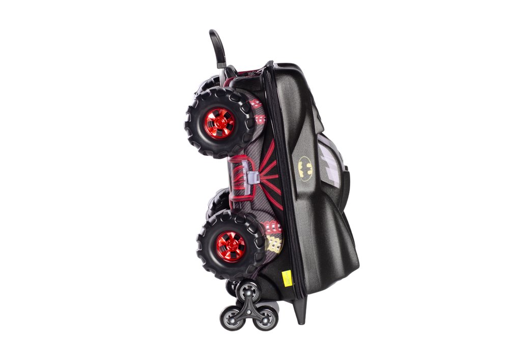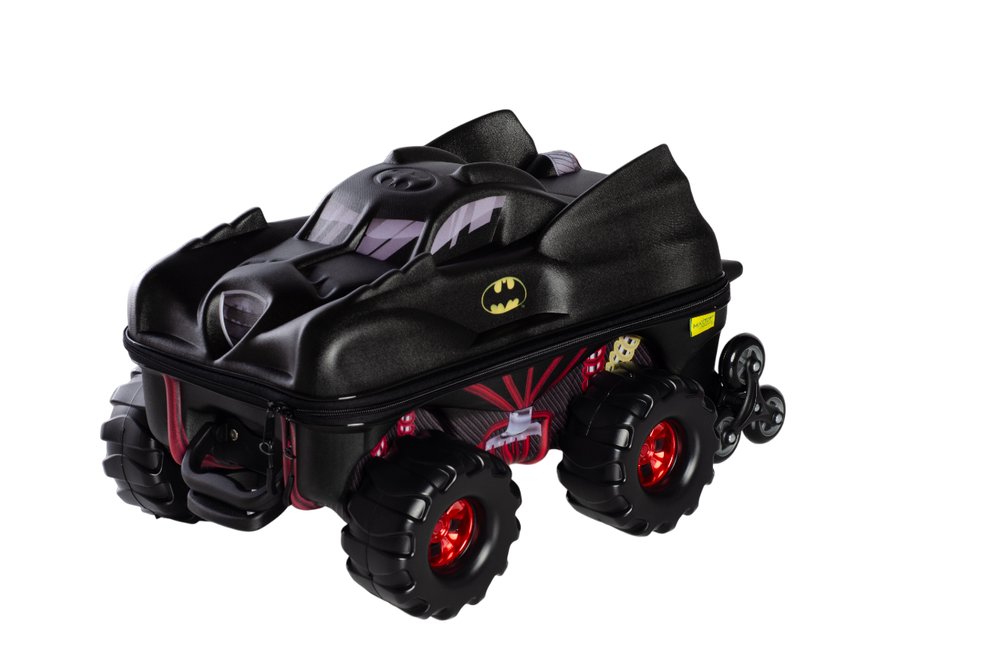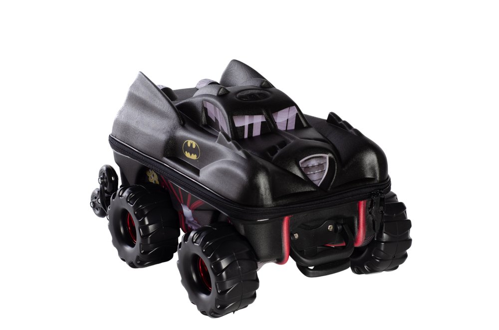 Com design exclusivo, realista e superdetalhado, a mala possui acabamento em alto-relevo 3D, aerofólios laterais, rodas robustas com detalhes em vermelho metálico brilhante e a icônica logomarca do Batman, trazendo o visual marcante do Batmóvel para o dia a dia das crianças.